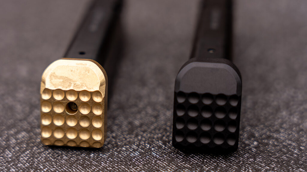 I also upgraded the Walther base pads with ZR Tactical’s brass base pad and conversion sleeve base pad. For added weight to the gun, I prefer brass base pads, but especially for easier reloads, as the brass allows the magazine to drop quickly and freely from the mag well. The conversion sleeve base pad eliminates over insertion plus adds texture to the base pad to grip the magazine better when performing a reload. (zrtacticalsolutions.com)