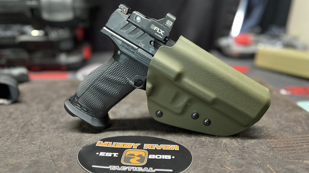 If you already own a Walther PDP pistol and have a holster for it, your current holster might fit the new PDP Match pistols. The new PDP Match pistols are not exactly the same as the original PDP guns, but because they are similar in frame size, length, and width, many of the PDP holsters are compatible. If you don’t have a holster yet, Muddy River Tactical offers outside the waistband, inside the waistband, light-bearing holsters, and even a Duty & Range Holster, which is what I use for the PDP Match. Muddy River Tactical truly customizes the holster to your gun. They have you choose your hand orientation, light model, and holster attachment choice. You can also add a matching magazine holster. The only thing I adjusted for the Walther PDP Match pistol was the trigger retention screws to fit the handgun properly. (muddyrivertactical.com)