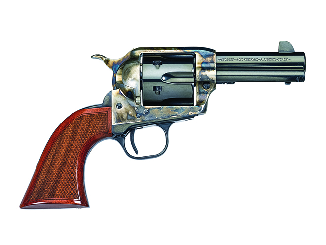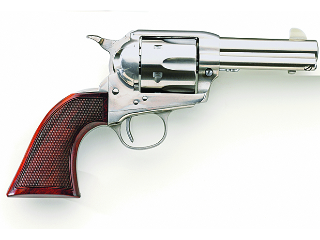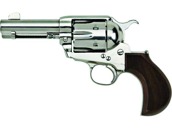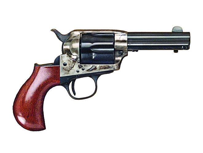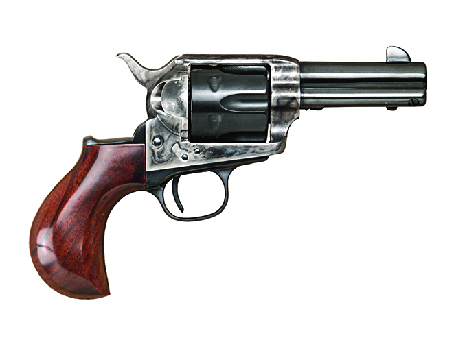 A hideout six-shooter in the Old West usually meant a short-barreled pistol that was easy to carry discreetly yet able to be brought quickly into play from across a card table or across a room. Bankers and shopkeepers kept them hidden just in case, and lawmen and outlaws used these hideout guns as backups. The shorter barrel on these revolvers made them more concealable yet, because they were based off of full-sized pistols, they were still chambered in powerful calibers. There were no compromises with these discreet pistols. Originally, Colt’s Sheriff’s Models had short barrels and no ejector rods; Colt Shopkeeper’s Models had short barrels and ejector rods. Today, Mounted Cowboy Action shooters who need a quick-drawing gun that can easily be cocked one-handed favor modern reproductions of short-barreled revolvers. Some of these models incorporate a bird’s-head grip, making the gun more concealable and easier to shoot for those shooters with smaller hands. They are also chambered in powerful calibers, making them excellent self-defense guns. Without further ado, here are some of the best.