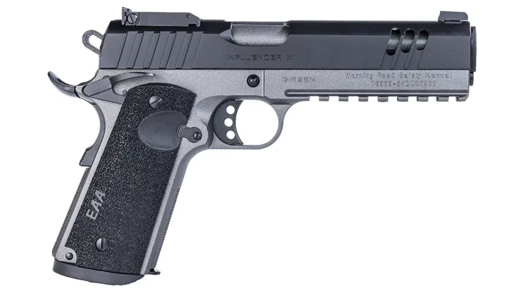 The Influencer X is a full-size single stack 1911 available in 9mm, 10mm, 45 ACP, or 38 Super. It is optics-ready with an RMSc footprint and a fully adjustable rear sight cap. It comes outfitted with an accessory rail and 5-inch government-size barrel and has a capacity of 9 rounds (except 45 ACP, which will hold eight rounds).