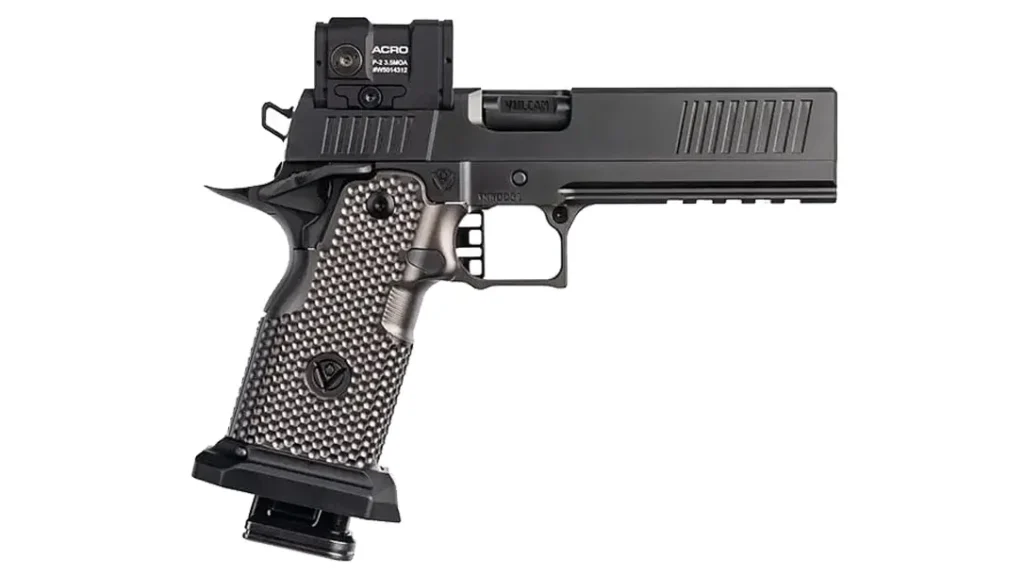 The biggest game changer for double stack 1911 lovers is the ability to directly mount your red dot optic with a mill optic cut machined by them, so you’re ready to go. This gun has many features, including a tool-less guide rod system, laser engraved angled serrations, the Vulcan square mag well, and more.