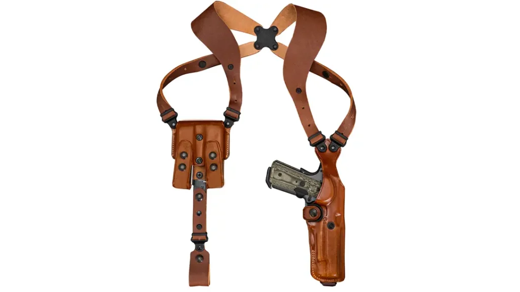 This horizontal shoulder holster is crafted from top-grain cowhide and includes a dual magazine pouch. Another DeSantis offering is the C.E.O. Shoulder Rig with a lower-profile half harness.