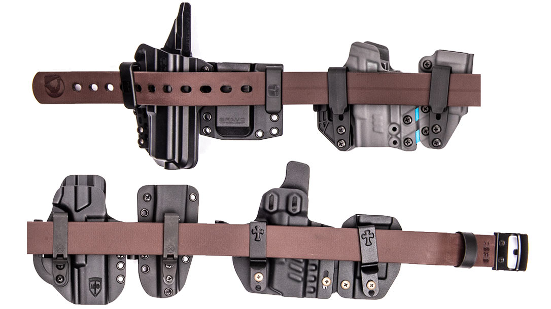 A sidecar magazine carrier attaches to the holster via a flexible, polymer-coated webbing that allows for some movement without binding. Its ride height is adjustable, and customers have their choice of three different types of belt clips.