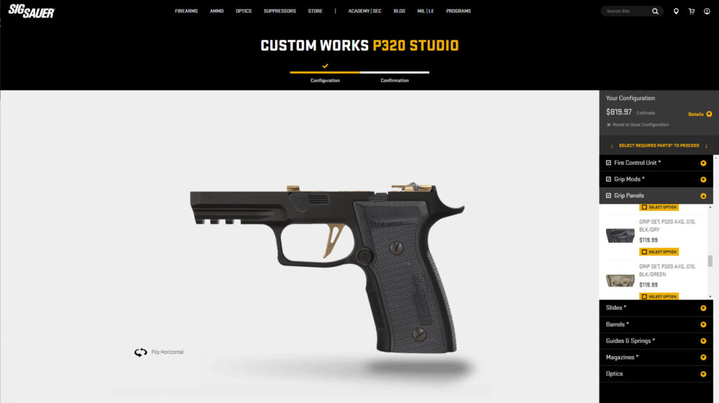 The process begins by making an account and then going through each category to build your gun. The first choice to make is the grip module, in which there are several dozen choices. They span three colors and just about any size you could imagine.