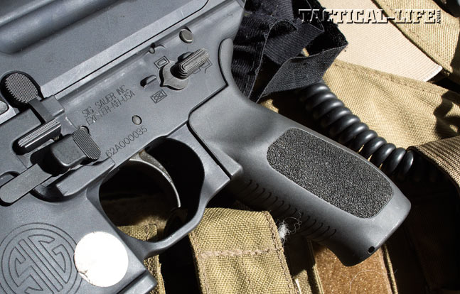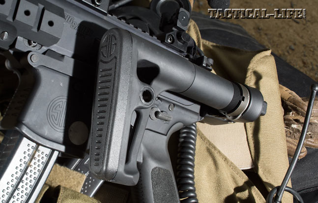 The MPX also utilizes AR-style controls, which makes for minimal training and transition time. Any AR-compatible trigger can also be installed. The remaining controls are also in the AR style, including the magazine and bolt releases—all are ambidextrous. A non-reciprocating charging handle is similarly placed and does not interfere with any rail-mounted accessories. While the excellent SIG516 pistol grip is used, any AR-based grip can be added. Stocks are interchangeable and can be configured based on mission needs.
