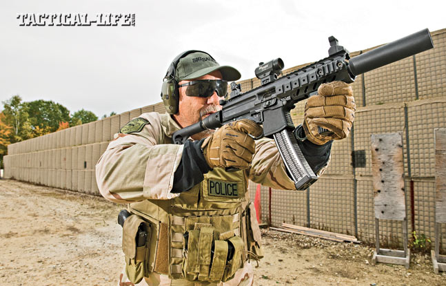 I tested a standard 9mm MPX using an 8-inch barrel and folding stock. The stock folded to the left and snapped into place nicely. You will be able to order a production gun that both folds and collapses. The prototype 9mm SIG-SD silencer was attached to the threaded barrel; it measured about 5 inches in length—just a bit longer than the standard model. For targeting, I had flip-up AR-style backup iron sights as well as a Sig Mini Red Dot Sight. Not only was this MPX a prototype, but it had seen some serious range time with an estimated 10,000-plus rounds of all types of ammunition run through it. I used both 20- and 30-round magazines. For ammunition, I used Speer 124-grain FMJ rounds. All of the testing was done in full kit, minus a helmet.