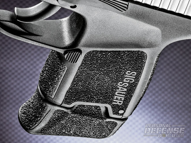 The P290RS comes with two magazines: a flush-fit mag that holds six rounds and an extended version that holds eight. The extended magazine has a polymer grip extender with the same spider-web texture used on the grips. The pistol comes with a fitted, polymer, right-hand paddle holster with a slight forward cant.