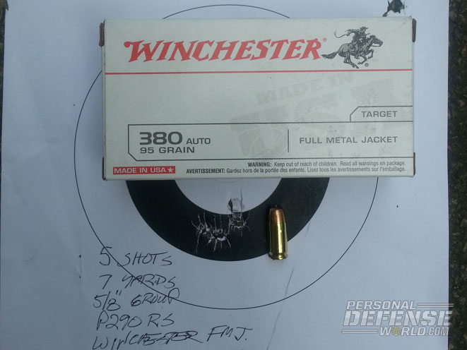 Accuracy testing was done at 7 yards using loads from Winchester, Federal and Black Hills. All loads shot very consistently and under 1.75 inches. The Winchester load seemed to perform best, with a best group of 0.65 inches and an average of 1 inches. This test only shows the P290RS pistol’s mechanical accuracy and ammunition consistency.
