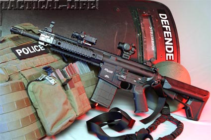 The 10-inch mil-spec barrel has a 1-in-7-inch twist rate and a Swiss-style flash suppressor. The handguard can be had in the standard configuration or with a quad-rail, as we tested it, which links up nicely with the standard Picatinny rail on the upper receiver. Folded, the rifle is under 20 inches in length and can be quickly deployed to its fully extended length of just under 30 inches.