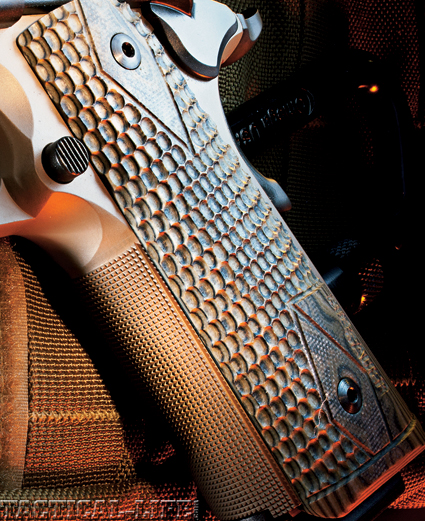 The Scorpion comes standard with a set of Hogue G10 “Piranha” grips that match up nicely with the checkered frontstrap.