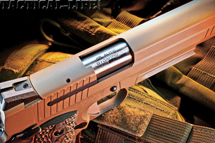 The Scorpion is a full-size pistol that uses the familiar Browning swinging link, locked-breech design. Sig Sauer makes all major parts in its New Hampshire facility and only a couple of parts are imported. The stainless steel slide and stainless frame are forged and finished with Cerakote—a ceramic-like finish made by NIC Industries that requires no special care to preserve.