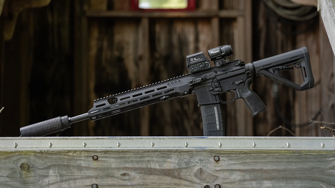 The rifle comes equipped with a SIG Matchlite DUO curved trigger for a clean, consistent break. A SIG flash hider compensator helps mitigate muzzle rise and flash signature, while the free-floating M-LOK handguard allows shooters to configure accessories to meet specific operational needs. From optics and illumination tools to foregrips and bipods, the modular platform supports mission-driven customization.