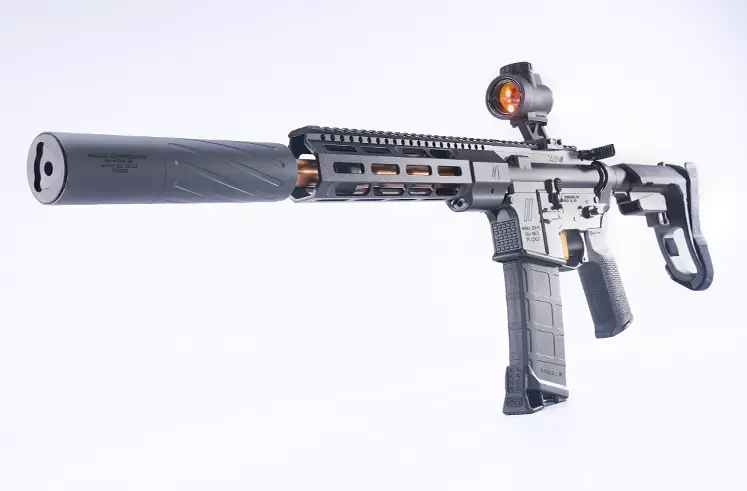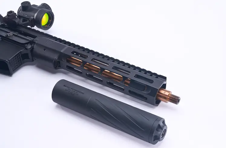 When we start talking about performance, the Db or sound rating of a suppressor is what is first mentioned. However, that can be very misleading, especially regarding the AR platform. When you fire an AR, you get three different sounds: the muzzle blast, the supersonic bullet breaking the sound barrier, and the mechanical noise of the weapon cycling after each shot. The purpose of a suppressor is to trap the expanding gasses from the end of the muzzle and allow them to cool and decelerate in a series of chambers. With this, the decibel level is reduced. Even with this, you still have the supersonic crack and action noise.