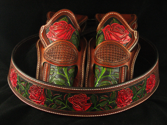 It is obvious that the double buscadero is the most favored rig that Slickbald creates. It is the largest “canvas” available in a holster rig. Although Chris does not admit it, he appears to have a penchant for red roses. What I think are some of Slickbald’s most beautiful and true-to-life carvings are of red roses. One particular holster I saw had large, full-bloom roses, and the belt was adorned with intertwining green stems, leaves and flowers in various states of blossoming.