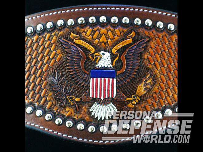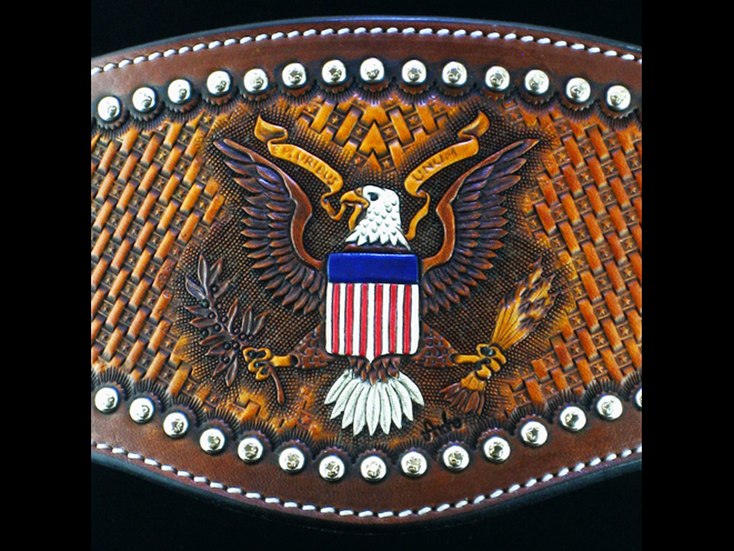 Lying carelessly in a heap was perhaps the most ornate and beautiful rig I have ever seen. Old Glory waved around the side of the belt, with its rich, majestic colors of red, white and blue. The holster’s body is a double-loop style with accent spots on the perimeter, and a carving of the eagle on the great seal filled the back landscape of the belt. This double buscadero looked to be made for a presentation of state or a display in the halls of government. Yet, it laid neglected. The fault? It did not fit the customer. Slickbald’s solution: Take it back and do it all over again.
