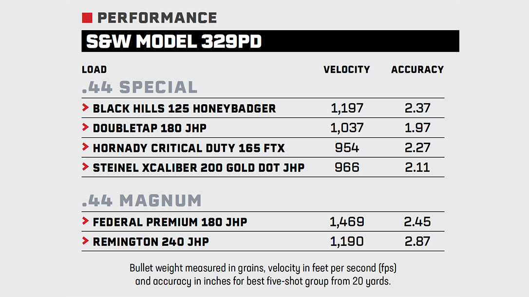 I wanted a lightweight .44 Magnum load for the 329PD and chose some vintage Federal Premium loads that carry a 180-grain semi-jacketed HP bullet at a factory-listed velocity of 1,460 fps. This bullet weight could prove to be useful against four- and two-legged critters. The gold standard for the .44 Magnum is the 240-grain bullet.
