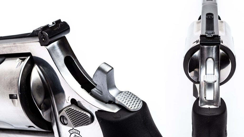 Smith & Wesson equips the M350 with a standard width trigger. It is devoid of any grooves or serrations and has radiused edges for smooth double-action shooting. Cocking the behemoth’s hammer is easy, and it possesses a sharply checkered spur. This is because S&W understands that most hunters will take advantage of the gun’s light and crisp single-action for a precision game shot.