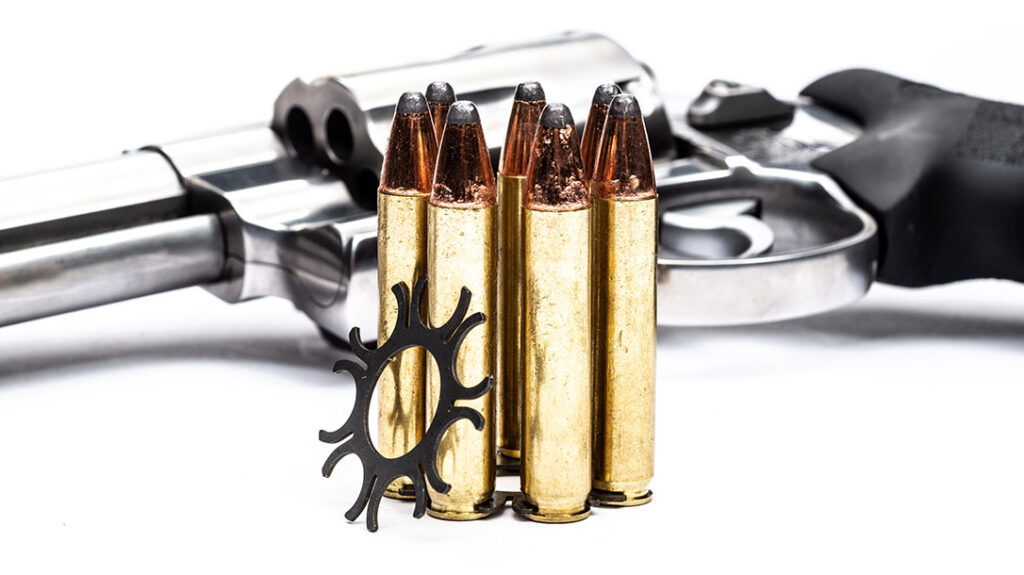 Winchester’s new Model 350 uses the X-Frame as a platform because of the round’s overall length. S&W chambers the big, beefy cylinder for seven rounds, and there is plenty of meat between the charge holes. S&W includes two stainless steel moon clips with the gun, and it is easy to clip the 350 Legend rounds into them at the round’s extraction groove.