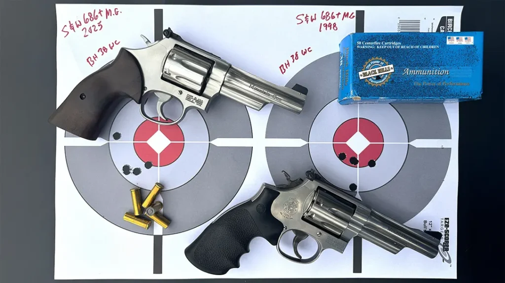 Just for fun, I brought along my 1998 Model 686 Plus Mountain Gun. I pitted it against the 2025 Mountain Gun, using the Black Hills wadcutter cartridges. Shooting was from the bench, SA, five shots with each revolver. I held 6 o’clock of the red center aiming point of the target.