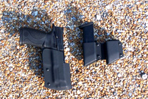 Leather is already out for it, with more coming. It is just barely larger than a 9mm or .40 M&P, and though it will fit a Blade-Tech holster for the smaller model if you loosen the screws enough, Blade-Tech is coming out with holsters and magazine pouches expressly for the M&P .45ACP. I spent a day carrying mine next to bare skin, under a polo shirt in a Deep Concealment IWB holster by Elmer McEvoy. It was perfectly comfortable, and nothing dug into my body. The Deep Concealment has built up leather on the body side that shields the skin from the slide serrations.
