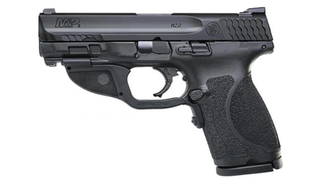Smith’s laser-equipped M&P M2.0 Compact sports a four-inch barrel and comes standard with a white=dot front and white two-dot rear sight. Its magazine capacity is 15+1 in 9mm and 13+1 in .40 S&W.