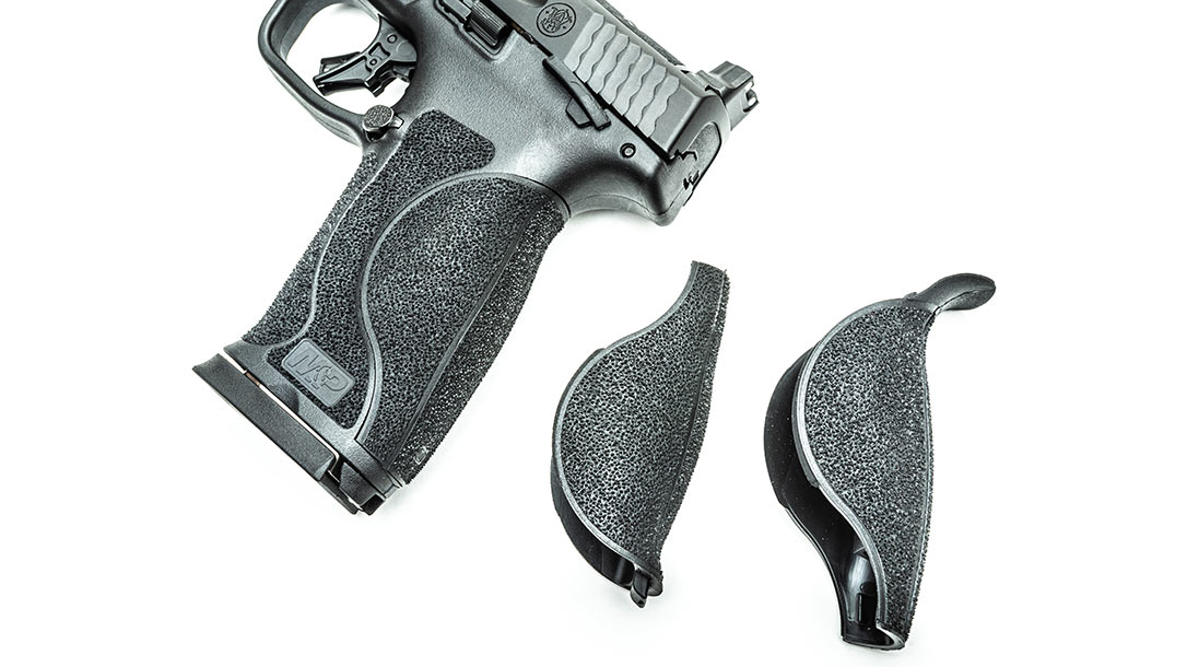 Four interchangeable palm swell grip inserts are included to ensure that any size hand can comfortably reach the trigger and still take advantage of the 18-degree grip angle. The grip texture on the M&P 2.0 is “enhanced,” providing a comfortable grip, especially during felt recoil.