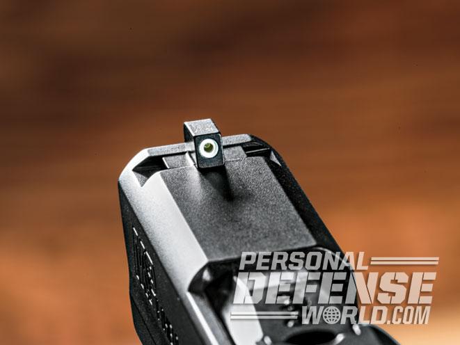 I like the three-dot configuration of the Shield’s factory sights for quick, defensive shooting, but I prefer night sights. With the Shield’s rear sight already off for the Apex trigger installation, it was the perfect time to replace the sights as well. Enter the I-Dot sights from AmeriGlo. The I-Dots offer tritium inserts in either green/green or yellow/green configurations. I prefer the front sight to be a different color than the rear, as the color difference makes getting a sight picture faster in low-light conditions.