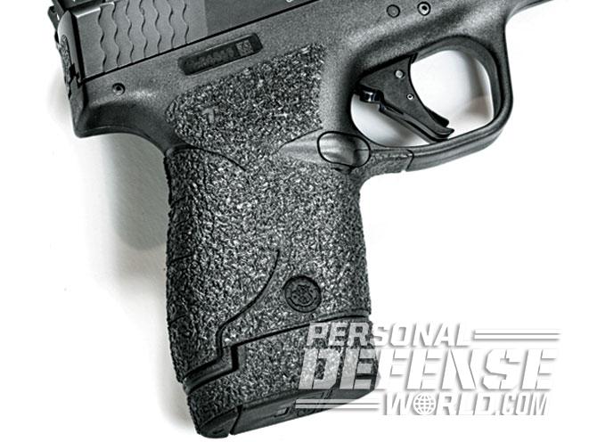 All of my polymer handguns sport some sort of grip enhancement to aid recoil control with slippery hands. For the Shield, I used Talon gun grips. Available in either rubber or granulate textures, Talon’s stick-on grip panels are available for numerous makes and models.