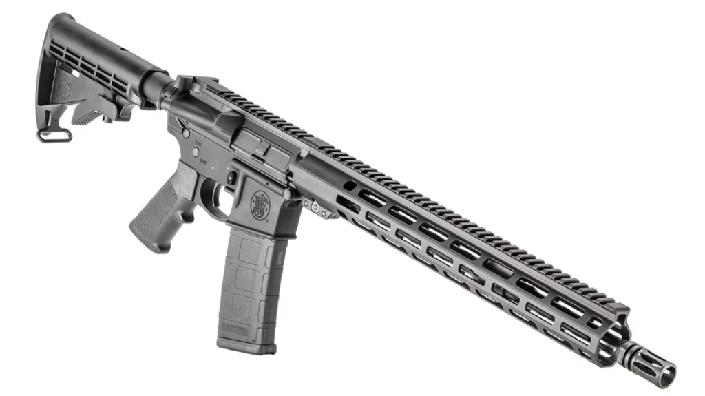 Like its predecessors, the Smith & Wesson M&P Sport III is a direct-gas impingement rifle chambered in 5.56 NATO. It features a 16 inch barrel and wears a standard A2 flash hider. Likewise, the Sport III ships with basic AR furniture like the standard six-position telescoping buttstock and A2 pistol grip.