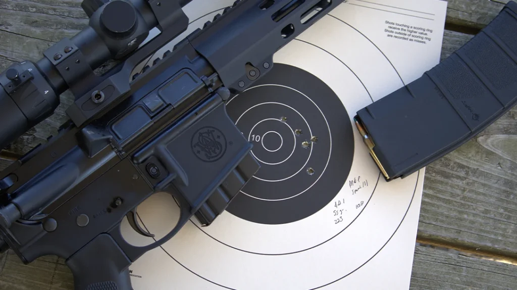 I took the Smith & Wesson M&P Sport II and Sport III rifles out together. My goal was to see how the changes in the latter model are reflected on the firing line. I set up the Sport III initially with a Vortex Crossfire 1x red dot optic. After the first hundred rounds downrange, I switched over to an EoTech Vudu X 2-12 rifle scope. The Sport II originally came with an A2 front sight and an MBUS rear sight. The rear sight has long been replaced by a Primary Arms SLx 3x prism sight, which I ran in this test.