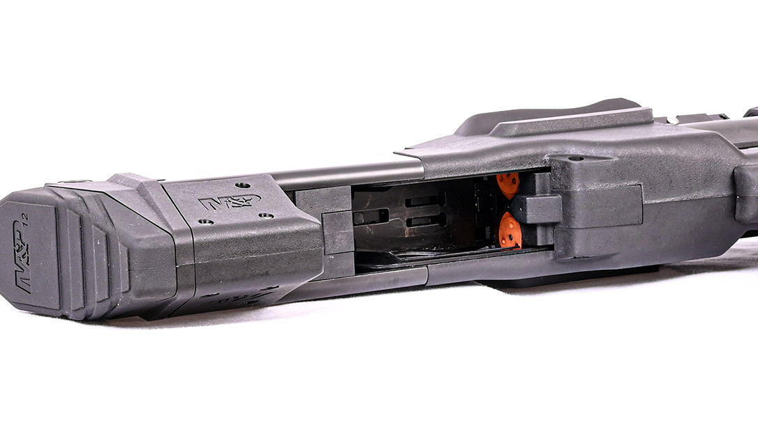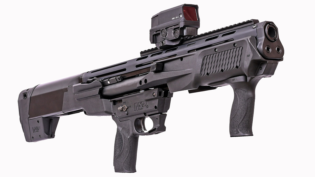 This S&W 12-gauge is a dual-tube-fed bullpup that can accept a combination of standard 2¾-inch, 3-inch Magnum and mini-shotshells (no adapter needed). So that means you can load a total of 15 shells (2¾-inch), 13 (3-inch) and 23 (mini-shells).
