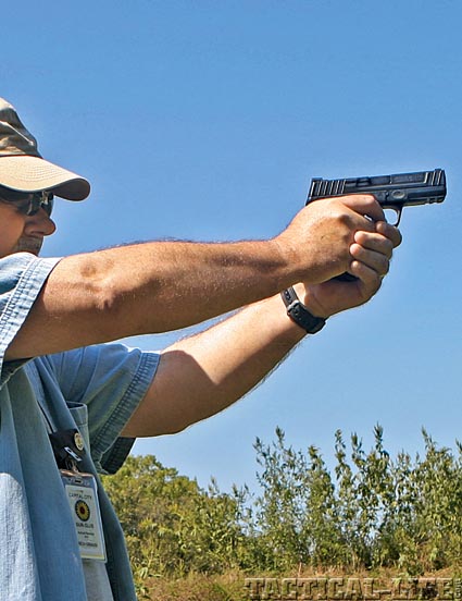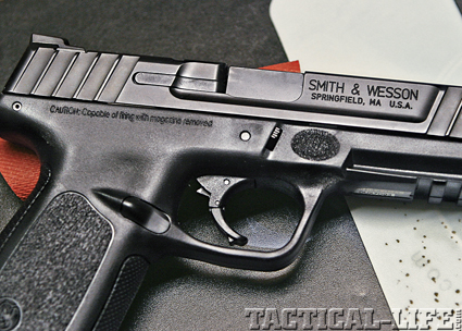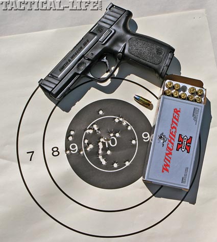 The magazines could use some roughening on the sides. You don’t want to lose it during an emergency reload. The front sight—supposed to be a night sight—is dull on my sample. The vial is apparently empty. After the front sight gets replaced, I’d like to get this back. I’d like to carry and shoot this gun more just to see how durable it is. But it shoots like a house on fire and is a great self-defense gun. Find out more by calling 800-331-0852 or visiting smith-wesson.com.