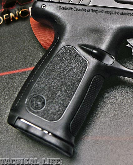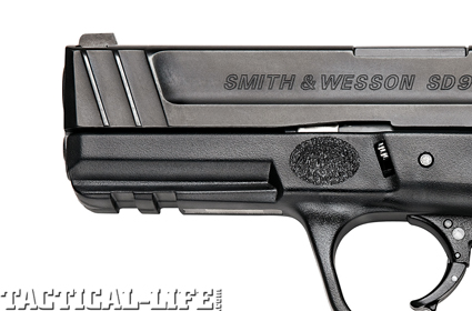 The SD9’s polymer grip frame sports molded-in checkering patterns as well as stippled patterns.