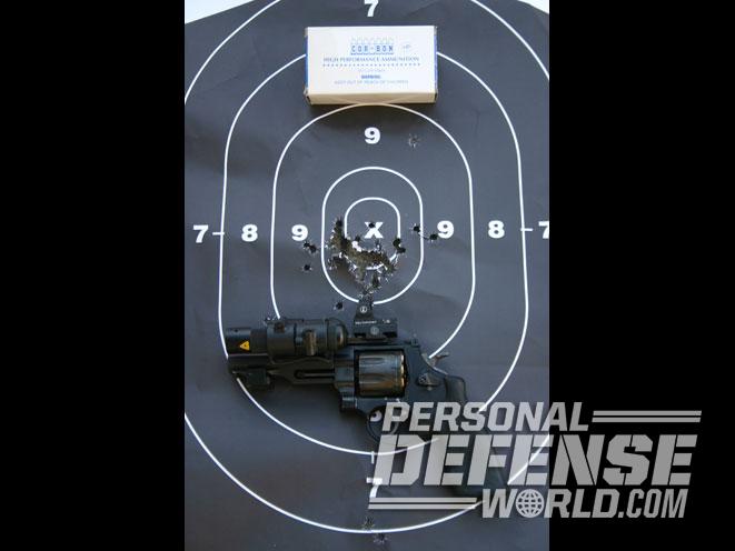 For a practical “home defender” evaluation, I modified a combat qualification course I used in my position as an LE agency firearms instructor. Normally employing 30 rounds, I had to modify it for the eight-round cylinder capacity of the M&P R8, and therefore I ended up using 10 more cartridges than normal. As the CorBon loads were very controllable in rapid fire, I selected them for my practical shooting exercise on a B-27 silhouette target. Since I wanted to test its home-defense capabilities, I started with the gun held down and discretely positioned behind the right leg. Rapid reloading was also not really a factor, but a quick reload using the moon clip was done in the first test stage.