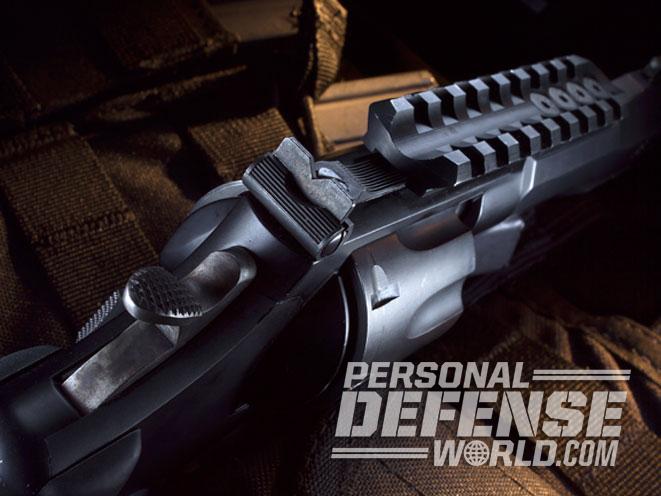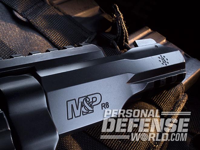 The standard Picatinny rails are integral with the shroud that fits onto the two-piece barrel system, so you have rails on top and bottom. The steel barrel shroud is held onto the smaller-diameter barrel with a special locking nut at the muzzle, which gives the barrel extra rigidity and more potential accuracy. Almost a throwback to earlier times, the barrel has a length of 5 inches. The shroud also forms the ejector rod underlug, which is also part of the ball-and-detent locking system in conjunction with the cylinder yoke. Up front, on the topside, the shroud becomes a ramp into which an interchangeable front sight is pinned. In this case, it’s a Patridge-style sight with a white dot. Also on the shroud is the special M&P R8 markings and caliber designation. To the rear of the upper rail is a fully adjustable rear sight that has a V-shaped notch, rather than the usual square notch with a white outline.