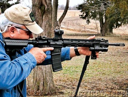 While the accuracy test is as sterile as I can get it here in the boondocks, the more practical exam comes with its use for intended purposes. I took the Trijicon AccuPoint off and added an Aimpoint Micro T-1. Troy Industries Battle Sights (front and rear) were supplied by Brownells. I installed the VTAC Light Mount and pushed the spacer out to give room for the SureFire G2 LED. This is a nice 80-lumen model; it gives good distance without overloading a white-walled room in conditions of darkness. You can have too much light—especially if you’ve been in the dark about an hour before hitting the on button!