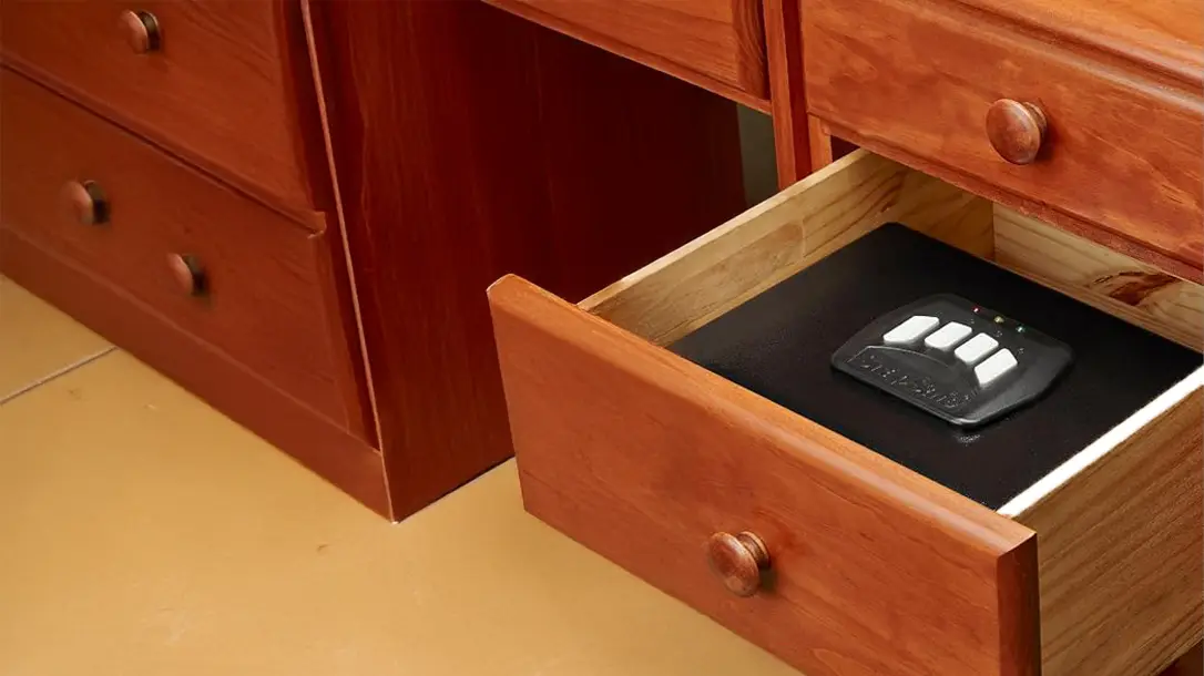 The One-Gun Keypad Vault fits neatly inside a drawer or cabinet, in a closet, or in various discreet locations, ensuring optimal security while allowing for quick access. You can easily mount it using the pre-drilled holes in its rigid steel frame. This vault is more than just a steel box. It offers a programmable 4- to 6-digit keypad code, guaranteeing excellent security and rapid access.