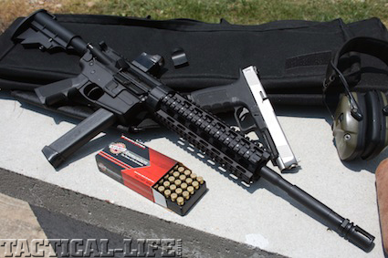 The folks from Oldtown, Idaho, are offering a complete 9mm carbine that is fed, naturally, by Glock 17 magazines. Of course it will accept 31-round G18 magazines as well. Close examination of the lower receiver indicates that while it might share similar appearance with a 5.56x45mm M4 Carbine-pattern AR, it is actually a dedicated 9mm receiver. This is particularly true when you examine the magazine well and the magazine release button located on the right side.