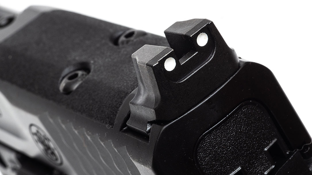 The rear sight features a 90-degree shelf that can facilitate one-handed racking off a belt, boot heel, post, or other surfaces that can catch the sight. This particular OSP model came with a slide cut for use with available adapter plates to mount various optics.