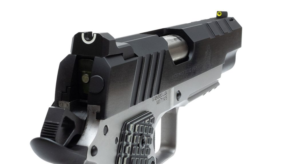 The piece de resistance, with regard to the slide, is the installation of Springfield’s excellent U-Dot sight arrangement. This set-up includes a white “U” outline on the rear sight and a front sight that offers a high-visibility yellow outline with a tritium insert for low-light work.