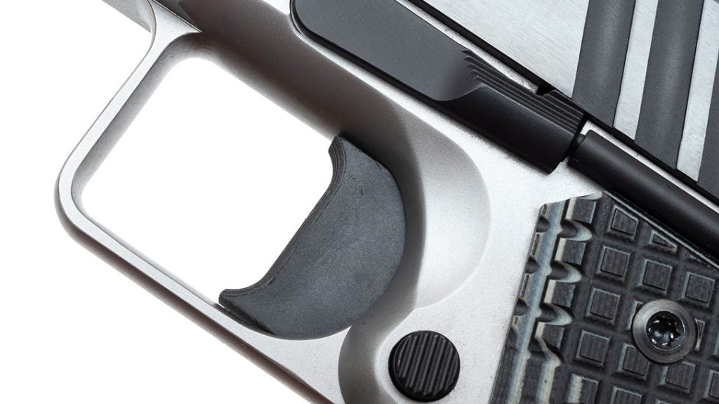 Plus, the square triggerguard is something different that you don’t see on a lot of 1911 pistols. Though you’ll probably need to have a custom holster made to fit this specific 1911. Finally, the frame also sports a Picatinny rail for mounting your favorite accessories.