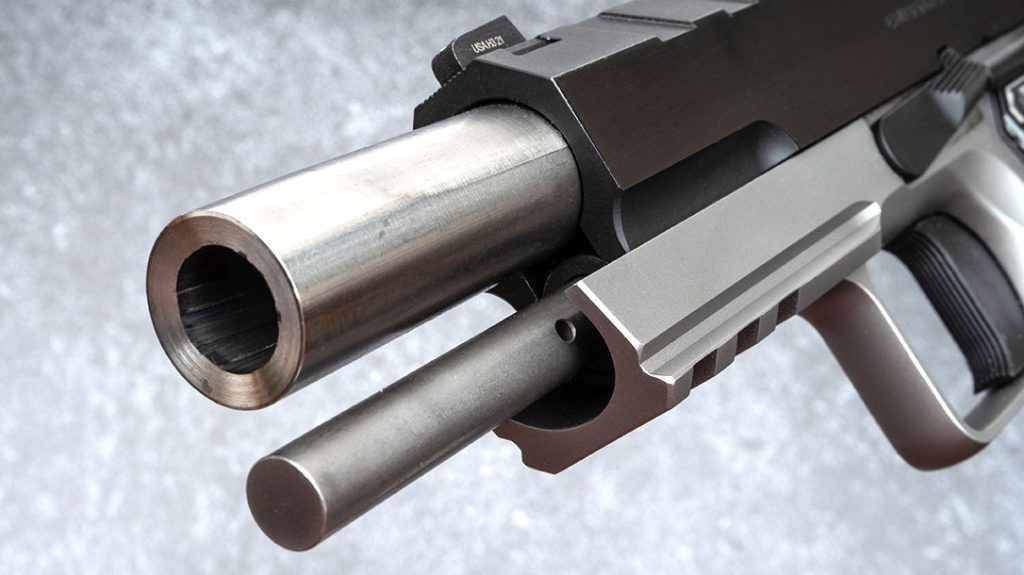 Turning our focus inward for a moment, we come to the bushingless barrel configuration. It is accompanied by a full-length guide rod assembly. Springfield went with a heavy-profile bull barrel that the company bills as designed for maximum accuracy. Likewise, it offers a bit more weight up front to reduce muzzle flip.