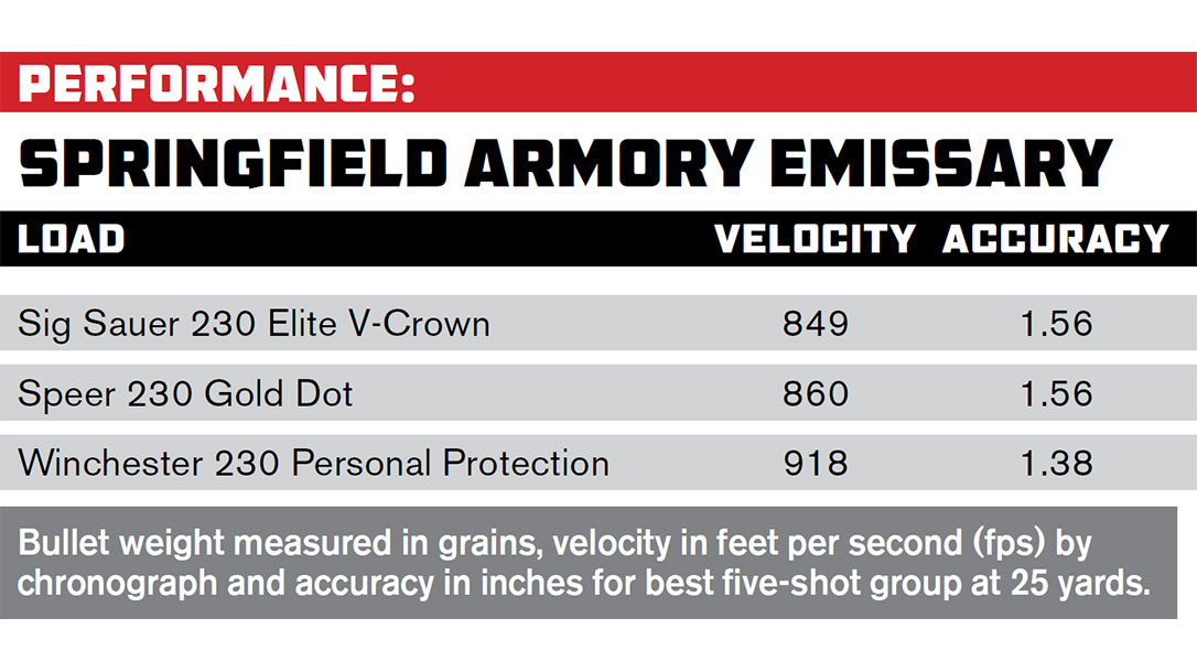 As much as people complain about a .45’s recoil, the Emissary’s 40-ounce weight goes a long way in solving that problem. Sure, in a compact pistol, the .45 ACP has a good bit of thump to it. But a full-size 1911 is all about big-bore power.