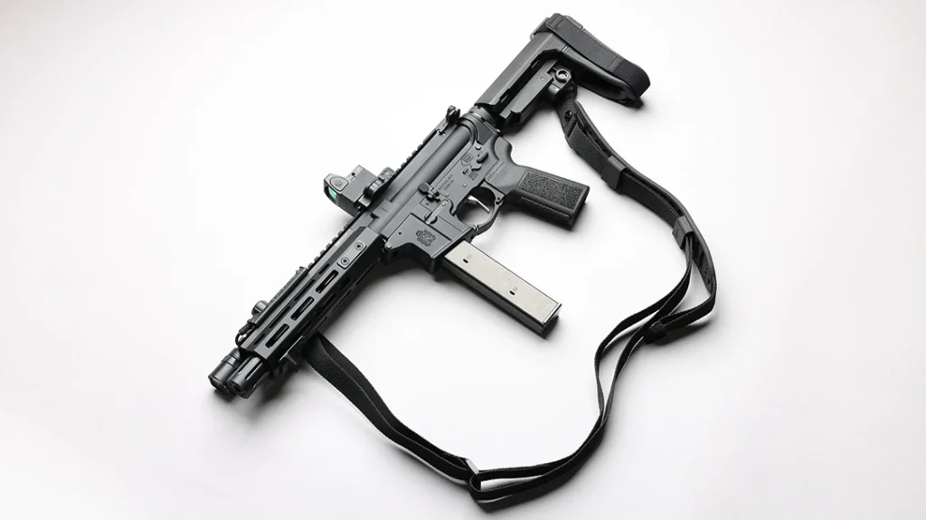 Speaking of details, the SAINT Victor 8.5″ Pistol runs on good ol’ Colt-pattern 32-round magazines, so you’ve got plenty of pews before you need to reload. An adjustable SBA3 brace keeps things stable, while B5 Systems steps in with a Type 23 P-Grip and polymer triggerguard to round out the ergonomics. And yes, there’s a 45-degree ambi safety so you can run it lefty or righty without a hiccup.