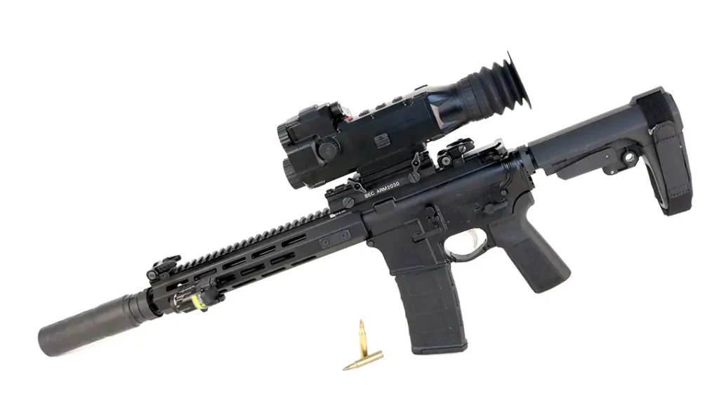 The mission here was to create the most effective survival weapon in the known universe. I mounted a Shinenyx AIM 101 fusion riflescope up top. This magnificent piece of kit combines thermal capabilities with a digital image intensifier to create a synergistic fused image that offers the best of both technologies. The sight includes a built-in laser rangefinder and GPS. The controls are both simple and intuitive, and the optic runs off of an internal rechargeable battery. The AIM 101 transforms the SAINT 5.56mm pistol into an all-weather, day-or-night counter-zombie beast.