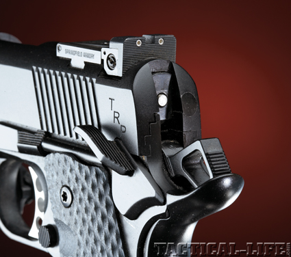 The TRP pistol line is truly a custom-quality pistol at a production pistol price. Many of the attention to detail seen in the Custom Shop Guns are present. The TRP features an excellent set of adjustable rear sights with tritium inserts.