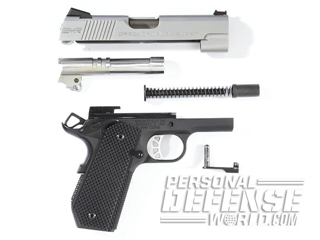 Using the 9mm cartridge was only the first of many changes that Springfield made. In fact, no fewer than 15 different components were redesigned to produce the EMP, including the slide, extractor, firing pin, firing pin spring, frame, trigger bow, trigger mechanism, plunger tube and spring.
