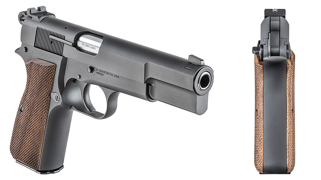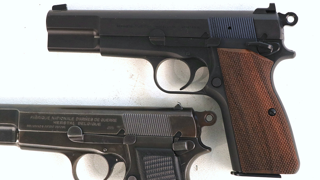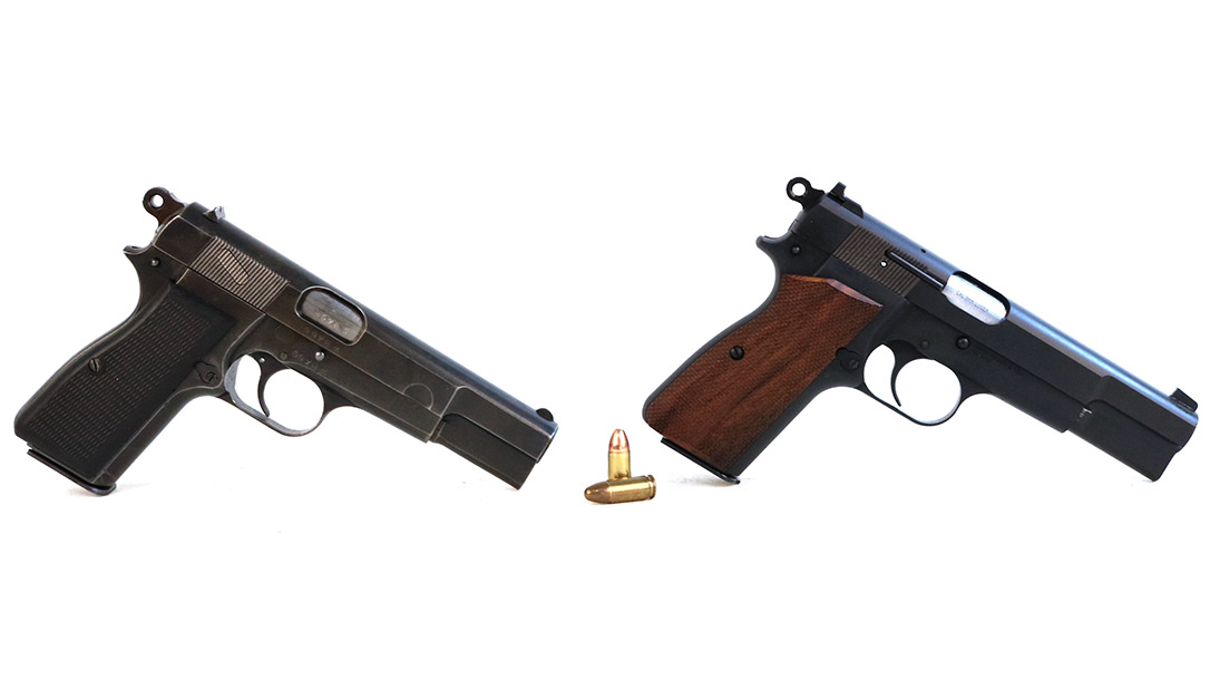 An original wartime FN Hi-Power made under Nazi occupation is shown on the left alongside the new-production Springfield Armory SA-35.