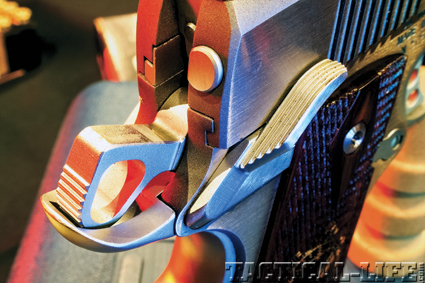The slide is CNC-machined from forged ordnance-grade 416 stainless steel. There is a slight bevel on the front of the slide to keep it from biting into holsters, and genuine Novak-style fixed night sights stuffed with Trijicon vials are set into dovetails. Deeply cut cocking serrations at the rear of the slide provide an excellent gripping surface for manipulating the slide.
