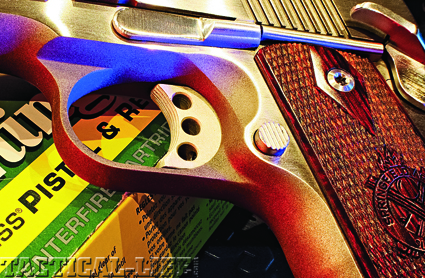 An initial handling of the pistol revealed that it had an excellent fit and finish. The slide was perfect. Moving my hand over the pistol, the only sharp edges I could detect were the cuts at the front of the rear sight dovetail, the rear edges of the front sight blade, and the edges of the thumb safeties. The grip safety was nicely blended to the frame. Slide stop, mag release, extractor, ejector, plunger tube and thumb safeties are hard-chrome-plated, creating an attractive, contrasting look with the gun’s finish. I was able to manage zero play between the slide and frame, other than the front-to-rear travel the design calls for. There was also no movement when I tried pressing down on the barrel with the slide in battery. The only exceptions to an otherwise exacting fit and finish were some minute machine marks on the lower leading edge of the slide stop, and that the extractor noticeably protruded from the back of the slide.